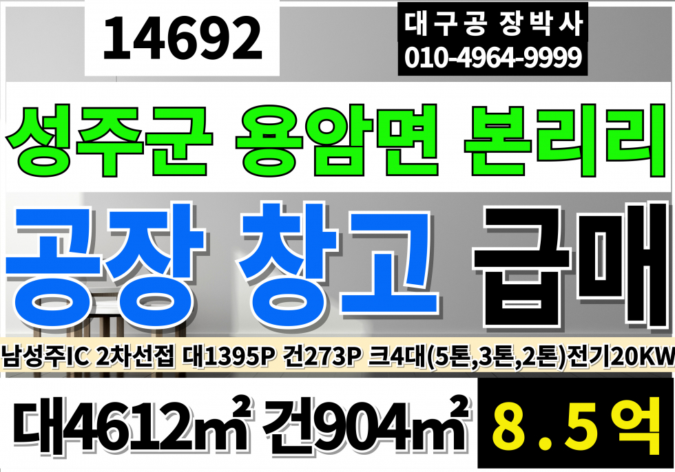 경북 성주 용암 공장 창고 매매 급매 대1395P 건273P 급매8.5억 2차선접 업종자유 즉시입주 대형차출입가능 호이스트4대(5톤,2.8톤,2톤)전력20KW 층고11M