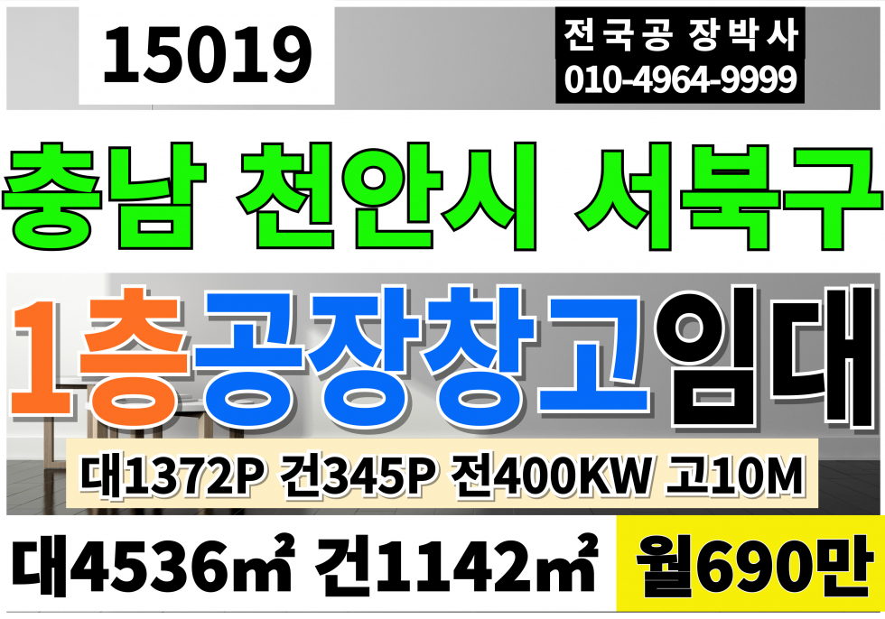 충남 천안공장임대 창고임대 천안IC 충남공장임대 공장동:1층공장345P(고10M) 전400KW